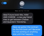 Wow! So much to love here in the fun text exchanges. Seeing the back and forth and bouncing back of ideas was super fun. I can’t wait to read Cheese & Quackers!