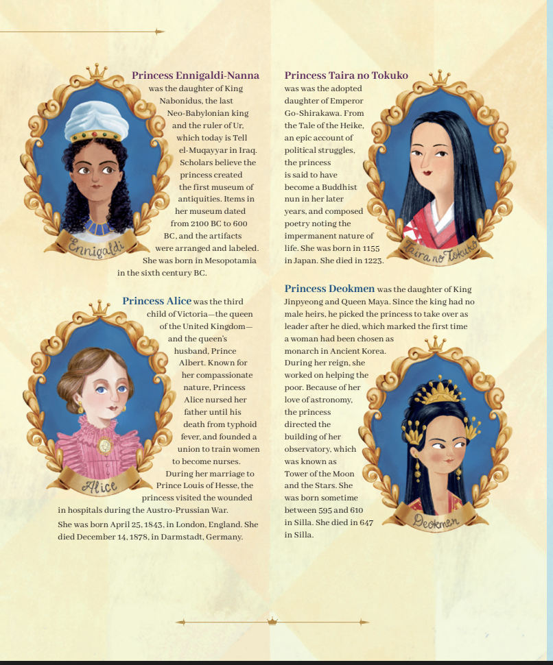 A princess from Iraq with an MD/PhD who did cancer research at Harvard and founded the United Nations International Day of Women and Girls in Science. A princess from Korea who loved astronomy and established one of the oldest astronomy towers in the world. A princess from Uganda who was the ambassador to the United States. The list went on and on. Honestly, I could easily write two more books on this same subject. The hardest thing was leaving women out. After all, so much of women’s history has been neglected. In fact, I discovered that no book existed documenting the accomplishments of real princesses, now and in the past, from diverse lands. (This gave me even more motivation to push forward.)