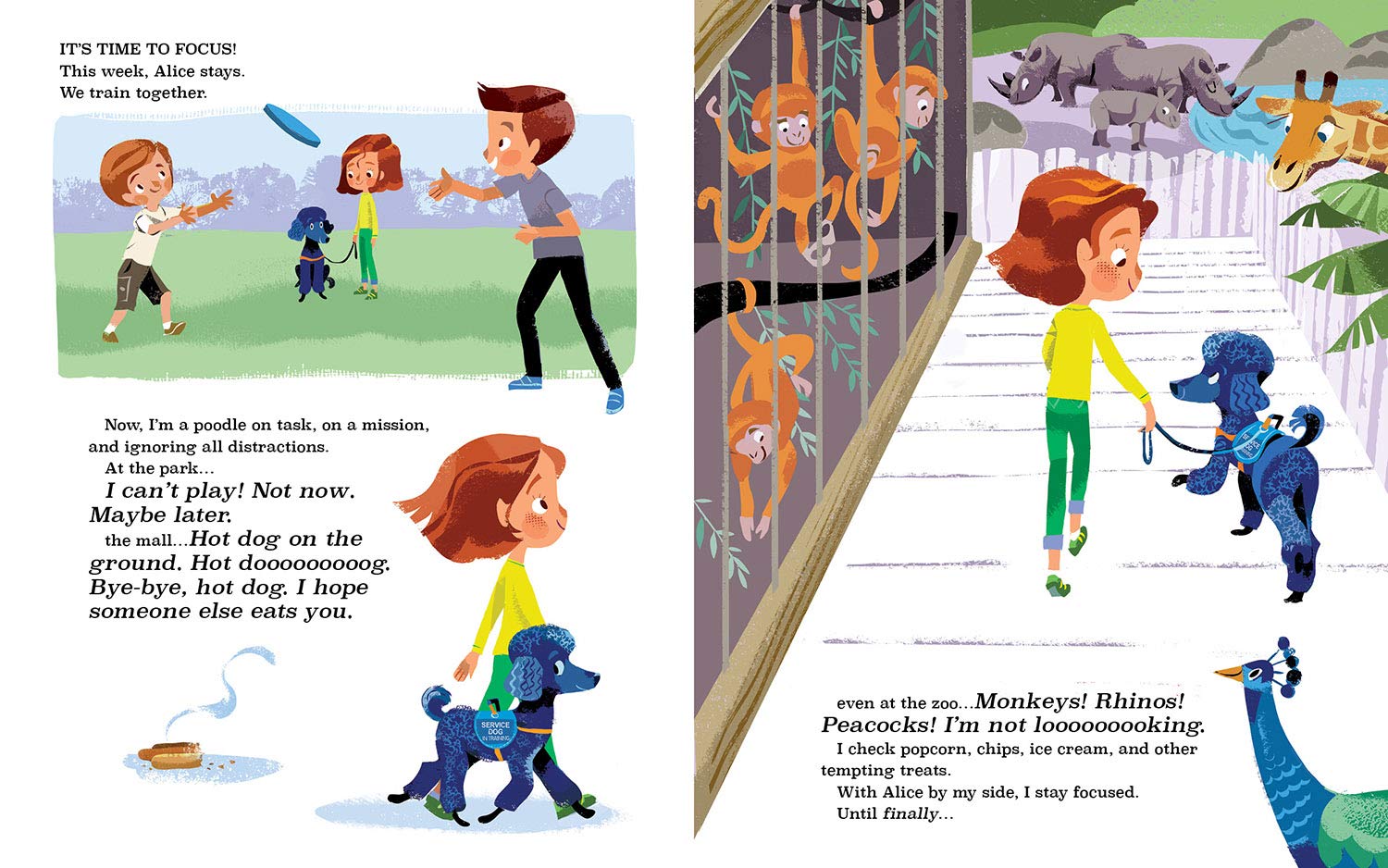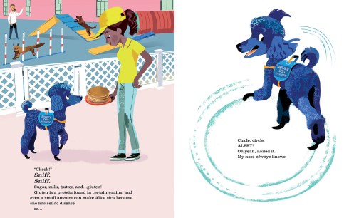 HA! Nicely done! And actually, that’s very similar to how I wrote about celiac. I used humor and a goofy dog as the narrator to keep the story interesting. By having Chewie sniff items like salad dressing, vitamins, and shampoo, I was able to show that gluten hides in unexpected places in a very kid-friendly way. It was my way of writing about celiac (and how it affects everything that we use) without saying it outright. After all, if Chewie needs to check things like medicine or lotion for gluten, then the reader automatically realizes those products could be unsafe for Alice or anyone with celiac disease. Additionally, there’s one spread in the book where Alice is too sick to do almost anything – she can’t even go to school anymore. All she wants is to feel healthy and normal again. I wanted this spread to be a window into the physical and emotional realities of celiac disease in a kid-relatable way. Luckily, my editor Andrea Hall also wanted us to include informational backmatter for parents and caregivers. So I was lucky enough to create a story that kids can enjoy, and still have a page for adults with celiac facts.