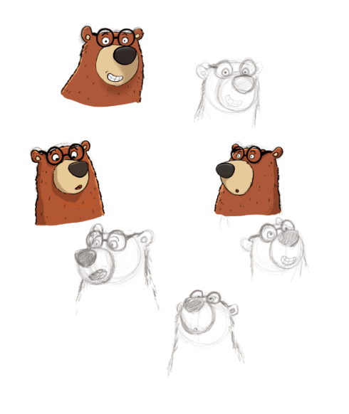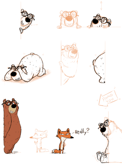 Yes! It was very quickly decided that Fergus was going to be a bear, since actually doing Waldo in my own story wasn’t really an option. I thought a large bear would be funny, and then I tried to give him a Waldo flair with the glasses to pay tribute to the “original”.