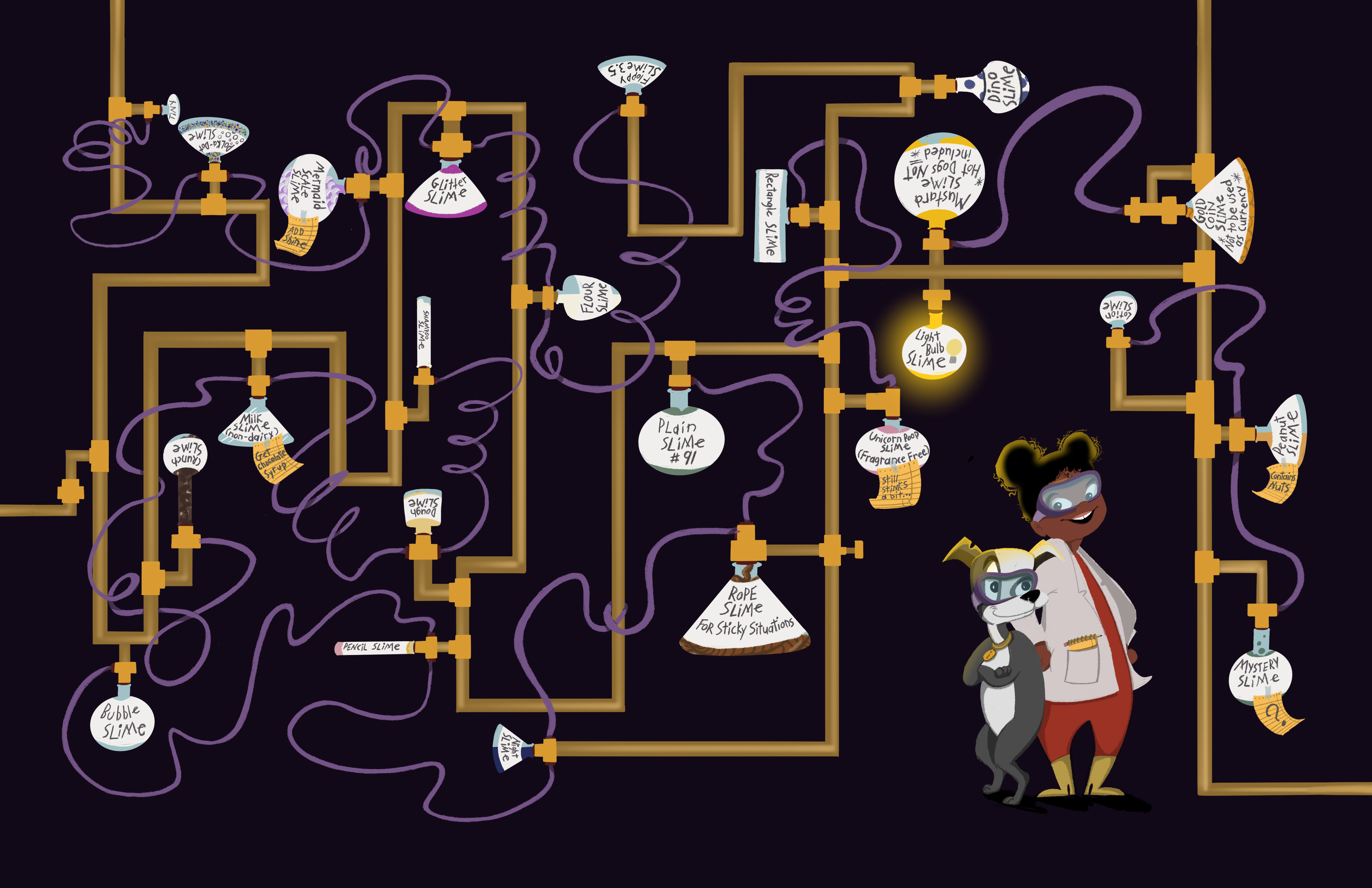 Inspiration constantly exists around us; we must be willing to recognize it or even create it. When I began thinking about how to illustrate this book, the first step was to completely immerse myself in my inspiration, literally! I made slime! Glitter slime. Fluffy slime. Ghost slime. Butter slime. Crunchy slime. You get it, I made a lot of slime. Being able to touch and feel and observe slime firsthand allowed me to learn about it through play. I had to think of myself as the main character, Victoria Franken, and interact with this substance. A lot of the funny scenes I drew were a result of my Pinterest slime fails and inability to admit defeat. I had a blast! As adults, we tend to look at things analytically and can sometimes forget to have fun.