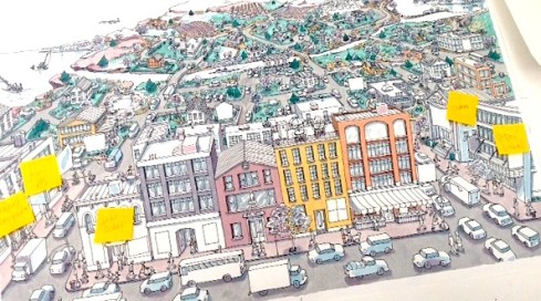 We were concerned about getting permissions to use images, but I discovered that the National Gallery of Art in Washington DC had just instituted an Open Access policy, so I used those images for the art in the book. The grand finale actually came easy—I just had fun figuring how to incorporate those mostly historic images into a contemporary city. Fragonard’s “Girl Reading” is a banner above the town library, Bellow’s boxers are used in a gym’s sign, Cassatt’s mother and child advertise a day care center.