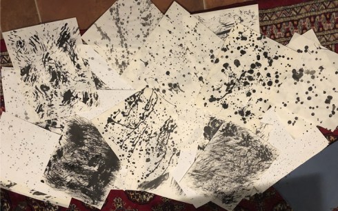 So, I finally broke out a fabulous gigantic Japanese brush I’d bought a few years ago in Singapore and I soaked it full of water so that it was completely saturated. Then, I brought it into my backyard where I dipped the sopping wet brush into India ink and flung it at watercolor papers. When I was finished, I had a huge stack of paper, each sheet full of splotches, spots, drips, etc. I created so many sheets because I didn’t want to repeat any of the elements.