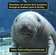 I was doom-scrolling Twitter very, very late one night, which is a bad habit I indulge in way too often, but this time it was a good thing! I ran across a tweet with this meme, which says manatees can control their buoyancy through an endless cycle of farting.