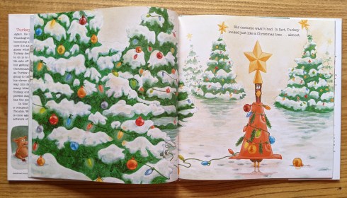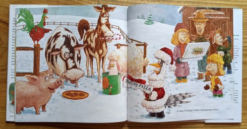 In TURKEY CLAUS, the farm animals weren’t featured until the last three pages, when Turkey returned to the farm from the North Pole. But unlike the first book, there is now only one representative from each different type of farm animal which I think is the beginning of the farm animals all developing distinct personalities.