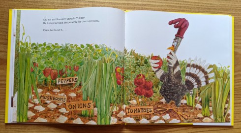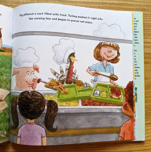 In this case I didn’t add any extra silliness because I thought the humor was in how thoroughly Turkey believes he looks like the lunch lady.