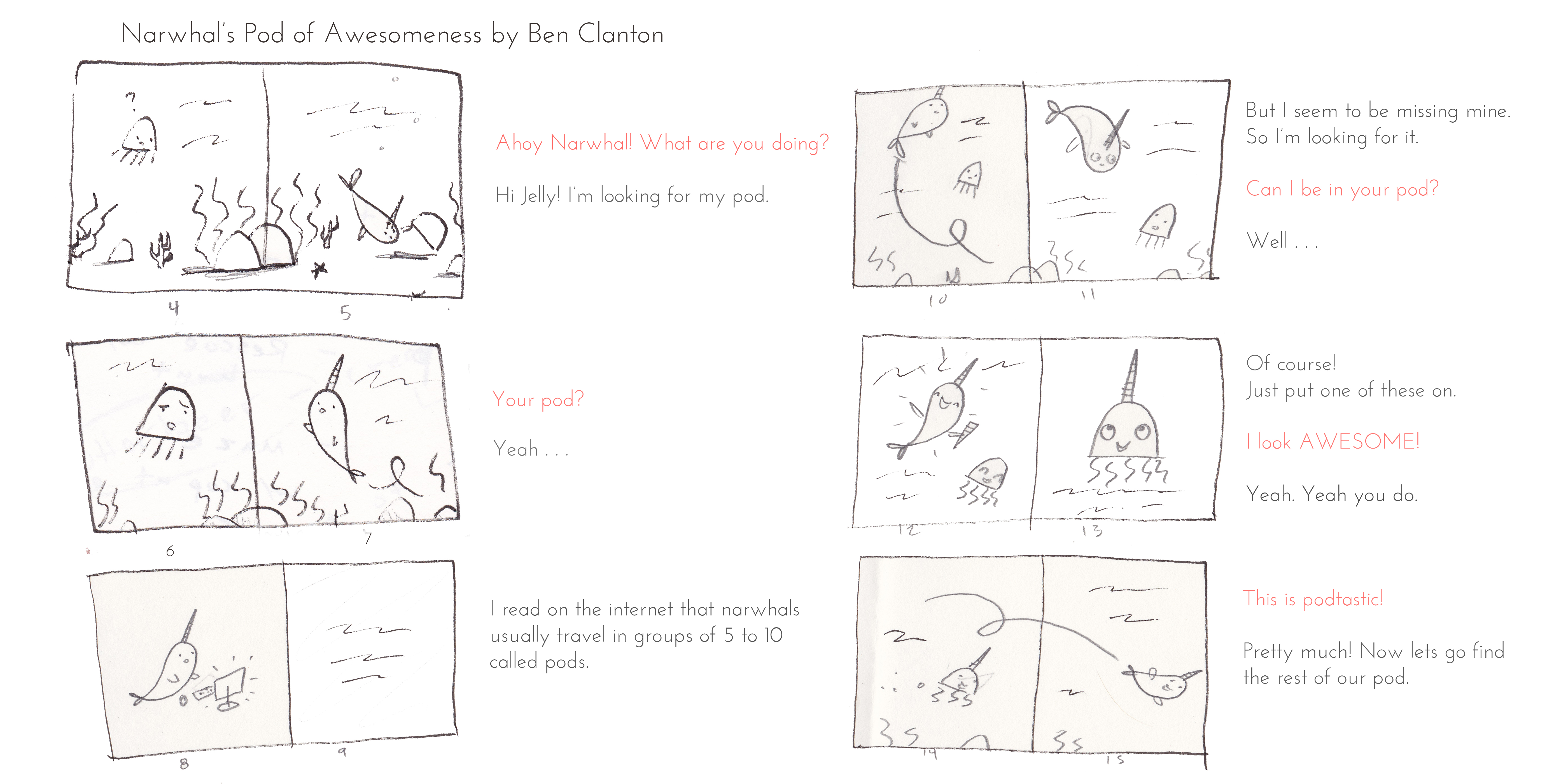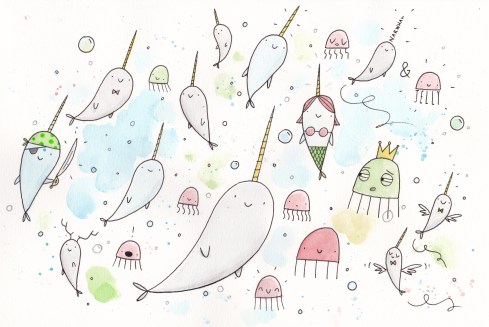 I first got it into my head that I wanted to make a book featuring a narwhal after seeing the book POLAR OBSESSION by Paul Nicklen several years ago. The book has some absolutely stunning photographs of narwhals in it and my mind was o-fish-ally blown. I must confess before seeing Nicklen’s book I didn’t really know about narwhals. That such a creature which seems so fantastic actually exists caught my imagination. I started doodling little narwhals even more than monsters, dragons, robots, or my other usual favorite subjects.