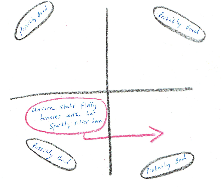 Once you identify some “Probably Good” ideas to start working on, keep your PostPiBo diagram handy. When you get stuck, pick out a “Probably Bad” idea and…just for fun…write a few lines of that story. Afterward, your brain may be a little bit more ready to focus. Or maybe you’ll discover a way to twist the bunny-stabbing unicorn into a “Possibly Good” idea….after all, it’s never been done.