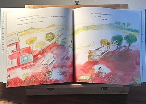 I incorporate environments I love if the story permits it. An example in our book is the double spread with the overview of the home, the distant hills and sky, and all the animals. This point of view is important to me because I’d seen it quite often as a child when I’d climbed to the very top of my favorite tall tree. I’d seen this landscape and loved looking at it. I wanted to set GRIEF IS AN ELEPHANT in this beautiful world and share this with the children reading our book.