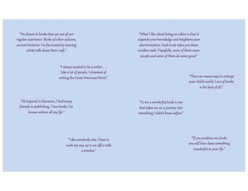 I also had included a lot of books Jackie read as a child and authors Jackie worked with and titles in the narrative. When we started to edit it, most were moved to the author’s note. And Bats Langley included them in the illustrations which was wonderful! Interestingly, at a sales presentation the team asked about references to the books that either Jackie read or edited. We already had some titles she read in the author’s note, so we decided to include a list of books. Narrowing it down to 18 titles was a taunting task; she edited nearly 100 books!