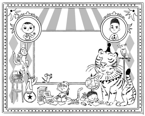 One thing I noticed in my research was a consistent use of graphic patterns and simple shapes. I had saved some images of old poster designs that used borders and shapes to highlight parts of the circus, so I thought that using a device like that show off the main characters, while also alluding to the busy school setting might be a good solution. I was also able to squeeze in a few animals friends on the cover as well which is always fun.