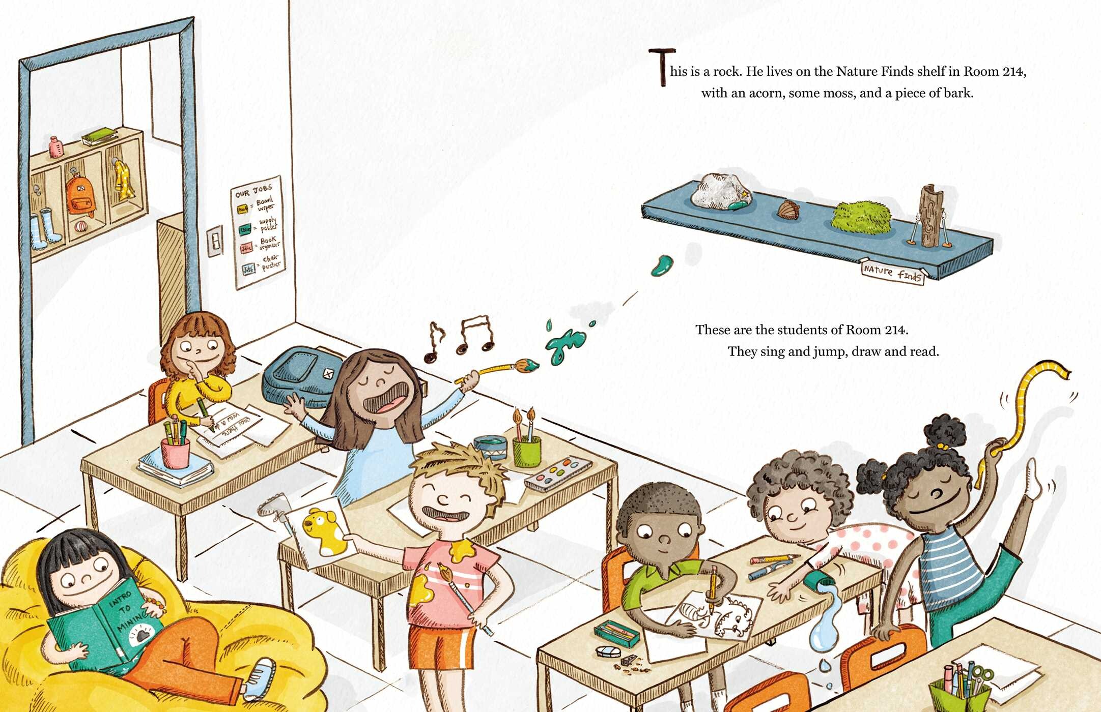 Julie, those of us working in picture books know that a story set at school is almost always welcomed by editors. Of all the things school is known for—why did you choose a ROCK who lives on the “Nature Finds” shelf in Room 214?