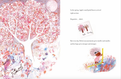 Britta’s attempts to help the two trees feel closer to one another (the scarf, the string telephone, the lights) changed over time…I remember my critique partners helping brainstorm ideas for that! As I got closer to the final draft, I added in tree language, like “Britta felt a seed of hope start to grow” and “Britta’s hope blossomed too.” Also, my initial title was TWO TREES, which of course grew into APPLE AND MAGNOLIA.