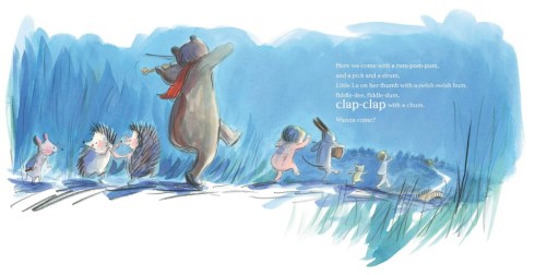Yes, it’s cumulative and told in rhyming verse. Making the rhythm and rhyme as clean as possible is key to a rolicking read-aloud. As for the plot, each accumulated line needs to up the ante in some way. In the case of HERE WE COME!, each new line introduces a different character making a musical sound—“a pick and a strum” (dog), “Little Lu on her thumb with a swish-swish bum” (toddler in a diaper—a real crowd-pleaser, by the way), “fiddle-dee-fiddle-dum” (enormous, jaunty bear), etc.. The characters and their sounds are increasingly unexpected or funny or joyful. And then comes the line that changes everything—“a drip on a drum”. UH-OH! Something climactic is about to happen! Of course, this building excitement or tension is accomplished through the synergy of words and illustrations. I was thrilled with how illustrator Christine Davenier staged this musical parade at night and included kids as well as woodland animals. The two adorable hedgehogs paired with the words “Clap-clap with a chum” nearly steal the show!