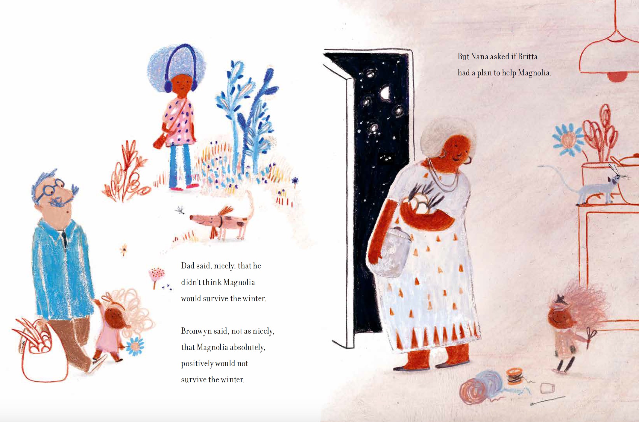 You’re right, the story isn’t just about trees. The story is also about Britta’s unwavering belief in the face of doubters. Britta is convinced Apple can help when Magnolia falls ill, and she doesn’t let Dad and her older sister Bronwyn dissuade her. But I wanted Britta to have a supporter in addition to the doubters…because I hope all kids can find a supportive adult in their lives, whether a relative or a teacher or a coach. That’s where Nana comes in.