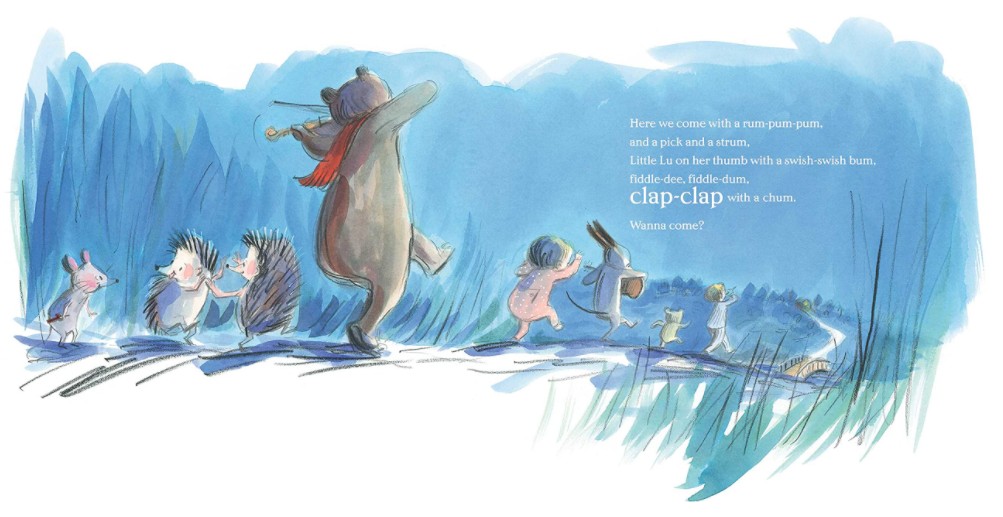 A boy sets off with his flute and his stuffed bear and a rum-pum-pum. As they make their way through the town and the woods, they ask, “Wanna come?” Soon, kids and creatures join in the fun one by one, playing instruments, singing, and dancing to the catchy tune.