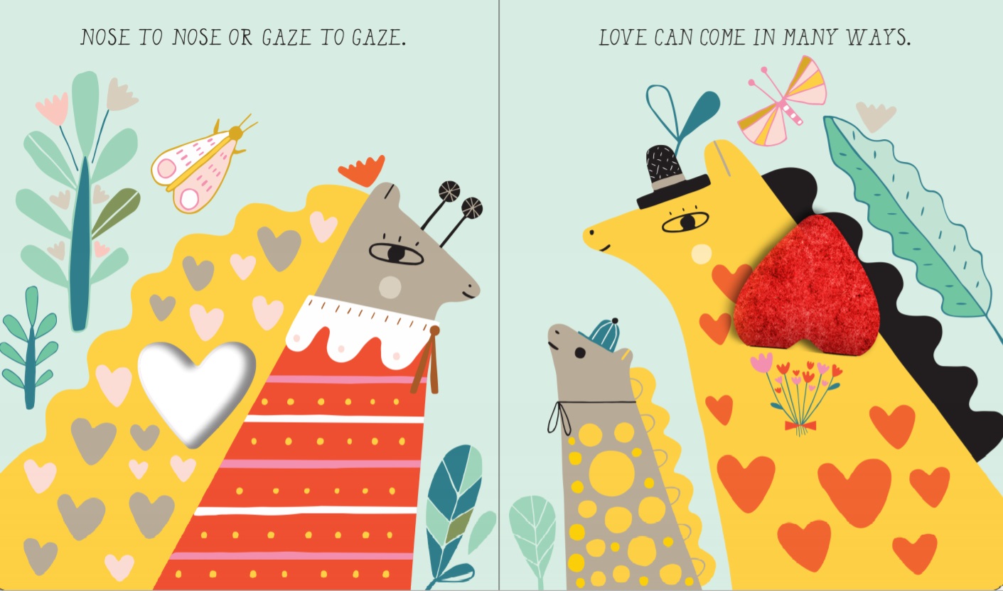 I decided to write a picture book about love, but wanted to make it super kid-friendly, so I used animals as the focus. For weeks, I poured over images of animals showing affection, which certainly filled my heart (and time—oh boy, what a rabbit hole it is to seek adorable animal photos online!). When I saw a photo of a mother and baby giraffe looking at each other, I had my opening line: