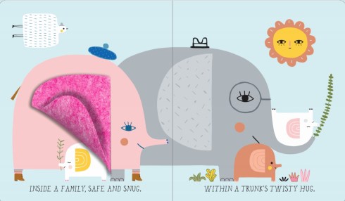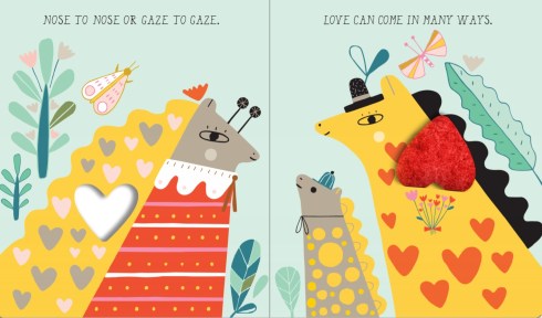 We did make some slight changes to the text but not to adapt to the flap concept. Suzy was so creative in how she implemented the flap idea—some flaps were body parts (an elephant’s ear, a swan’s wing), others were part of their design (a heart-spotted giraffe has a felt heart that lifts, for example) that I didn’t need to change the text and one even became a leaf.