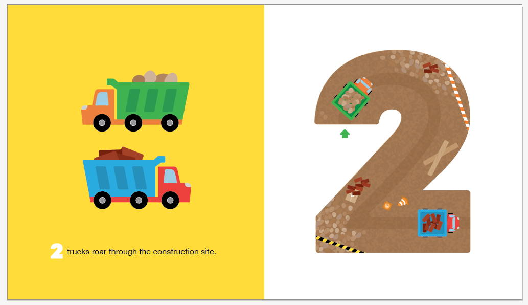 Where’s the novelty—the interactive features? This was the road maze that led to many dummies and production challenges. It’s been quite the journey, as novelty books go. I appreciate every speed bump, detour, and success along the way. My original idea consisted of cut-out vehicles on tracks that slide along the numbers, to encourage tracing and writing. This ultimately was cost prohibitive. I had to rethink the concept, and design a novelty that offered a similar experience, but was cost effective and inviting to touch. There was turbulence along the way, but also guidance and support from my amazing editor and agent. 123 ZOOM evolved with each spread featuring die-cut scooped out numerals and glossy, slick paths down the middle for tracing numbers, and discovering the many things-that-go. The dummy page pictured here was a work-in-progress, but the idea was to convey the novelty elements. There’s a seek-and-find element of surprise towards the end of the book, designed to encourage little ones to count backwards.