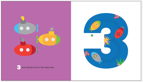 The truth is, I’m very art-driven and I focus on design and format first when brainstorming ideas. My goal was to develop a playful, interactive book for exploring numbers and counting. So why planes, motorcycles, and ships? They can fly, swim and zoom at amazing speeds, make loud, interesting sounds, and be bright and colorful. That was the inspiration I needed to dive into a format where little ones can adventure into their imagination and become powerful vehicles that journey through water, land, and sky. Number characters represent the scenes, from the deep sea to the big galaxy. How I present the art is key; highlighting different perspectives of the same vehicles in aerial and front views.