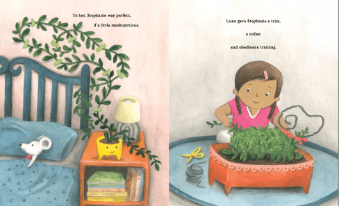My initial idea was sparked by a photo of a girl “walking” a plant. I wrote: “A child wants a plant for a pet.” Hmmm, an okay concept, different from a dog or cat story, (and walking your plant is SO cute!) but it still felt flat.