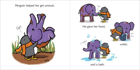 The elephant was different from a penguin in many ways; large body vs. small body, 4 feet vs. 2 feet, trunk vs. beak, rough skin vs. smooth feathers, large ears vs. no ears, tropical habitat vs. cold habitat, just to name a few contrasting elements. The goal I had was to find something unique that connects them despite their obvious differences. Once I found that piece in the story, I knew I had something to work with! The cover gives you a clue to what they share in common—they can both swim!