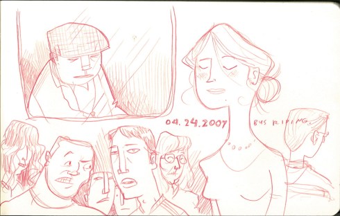 When I first moved to Portland, I would ride the bus back and forth to work daily. I loved noticing all the different assortment of people who’d ride along with me—some regulars, some not so regular. I began to bring along my 5 x 7 inch notebook to record some of these interesting characters and to at least capture the moments that might otherwise be lost if I didn’t somehow sketch them down.