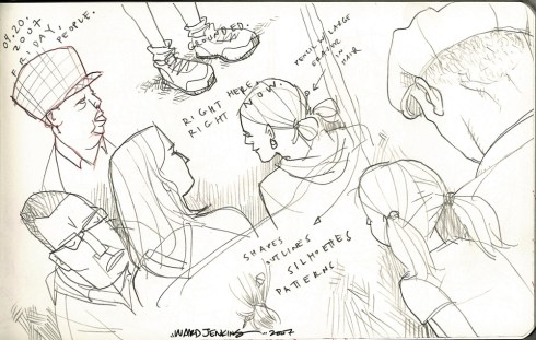 Now, I know what you’re thinking: “Hey, not all of us are as artistically inclined to just pick up a pencil and start drawing!” No problem. The same thinking that I use for drawing while looking at people and places around me can be applied for you writers who might need a jumpstart for coming up with ideas for characters.