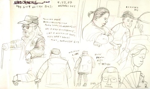 Every once in a while, a really interesting person would show up on the bus and I’d start sketching feverishly, capturing the details the best I could, as well as jotting down notes: