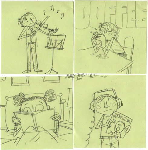 Ward Jenkins is an animator, illustrator, and lover of all things aesthetically pleasing. He is the designer behind PiBoIdMo 2012’s logo and badges, and his sketchbook shared here today is online at Flickr. Ward illustrated Michael Phelp’s HOW TO TRAIN LIKE A T-REX AND WIN 8 GOLD MEDALS, Sudipta Bardhan-Quallen’s CHICKS RUN WILD as well as Chronicle’s NEW YORK, BABY! and SAN FRANCISCO, BABY! Catch him blogging at Ward-o-Matic and if you like his art, you can get some for your walls at his Ward-o-Matic shop (Tara’s favorite, which hangs in her home, is “Speaking in Color”).