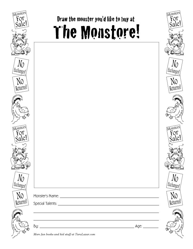 (Click on the image for larger version, mouse over for a + magnifying glass, click, then you can then print 8 1/2 x 11. Or, click here for a PDF: Monstore Draw Your Own Monster.)