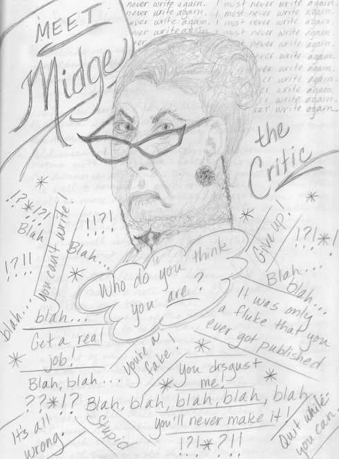 But first, you have to get past Miss Midge and her like. Those nasty voices that say miserable things to you. Here she is in my journal (and right now she’s saying “You’re not an artist, what are you doing!?!”)