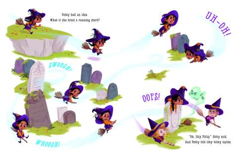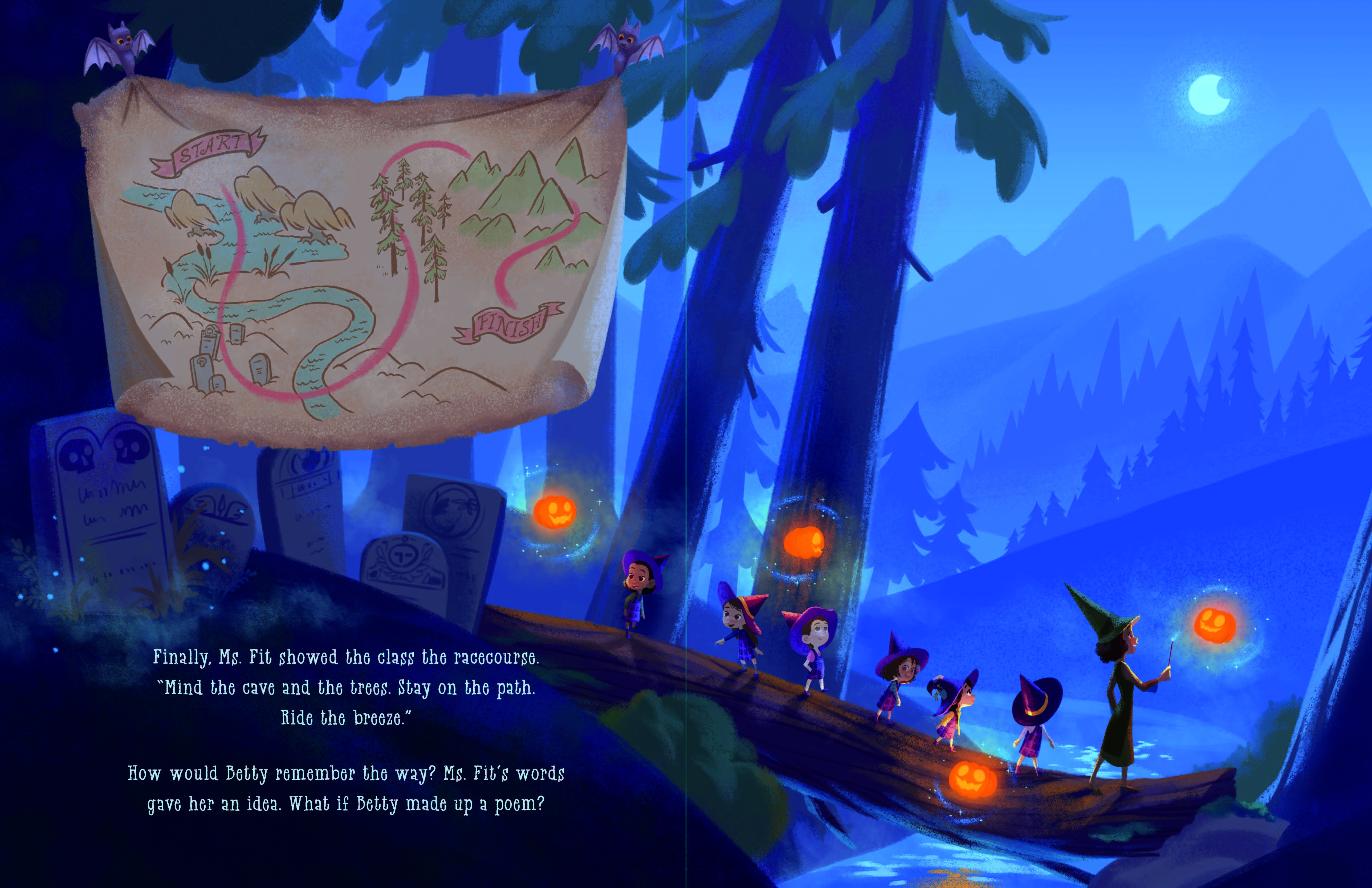 While creating the scenes where Betty’s trying to fly faster on her broom, I was inspired by comic books and LeUyen Pham’s work. I alternated from full-spread illustrations to spot illustrations to create visual breaks and change the pacing of the story.