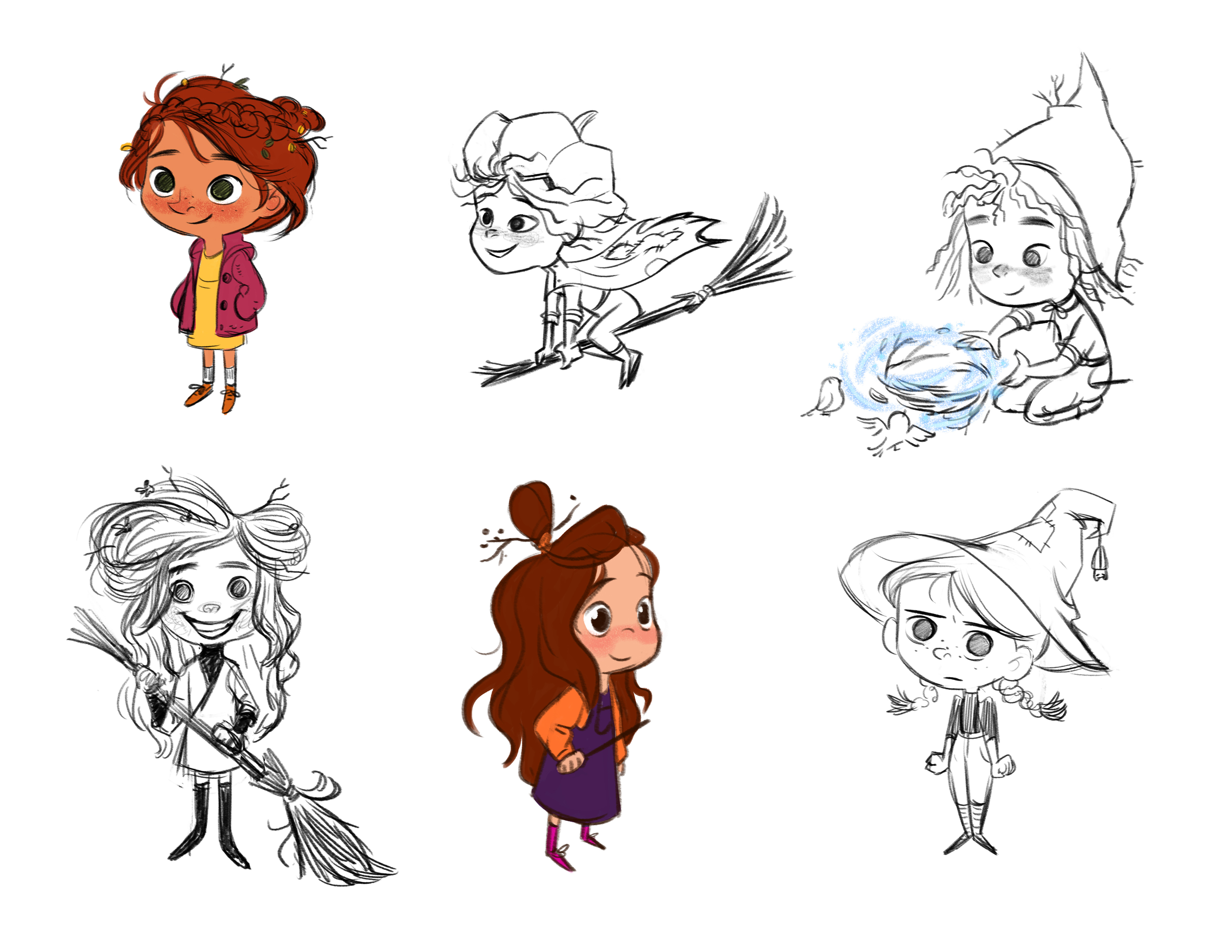 Betty Ann is a friendly, lovable, little witch. Her small stature is the focus of the story, so the character design process started there. Since she’s innocent and unreserved, I gave her expressive, bright eyes. I also believe she’s a confident girl, even though she experiences temporary defeat in the story. On the first day of school, she rocks her floppy hat, messy, carefree hairdo and a small broom, completely oblivious to others’ stares. Believing in herself is what pushes her to work harder and eventually win the race. The details of her outfit are different than her more “polished” classmates. I chose yellow for her top because it’s the contrasting color to the purple uniforms. Visually she pops out of any composition. Yellow also represents her warm, friendly personality and relentless energy. I was so inspired by the story, I did more than 20 variations on the initial character sketches of Betty Ann. The final design is based on bits and pieces from a lot of them.