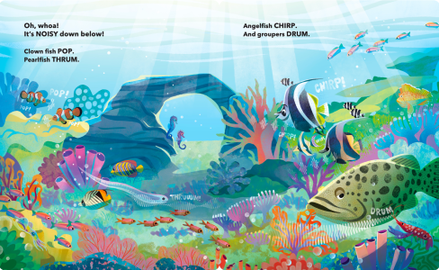 Yes! I could have taken a straightforward “here are some fish and these are the sounds they make and why they make them” approach. But in today’s competitive commercial nonfiction market I needed something more engaging. The fact that the story is about sounds dictated my direction. Onomatopoeia and rhyme swam into the mix! Right off the bat, I jotted down simple rhymes based on sound descriptions assigned by scientists: Boop! Whoop! Moan! Groan! So fun! I realized this could become an amazing read-aloud. (Later, I added a refrain, (It’s Noisy Down Below!), some direct questions to engage young readers, and recurring cameos by the amazing snapping shrimp—a little “Easter Egg” on each spread. Lots to explore visually and lyrically and encourage re-reads!)