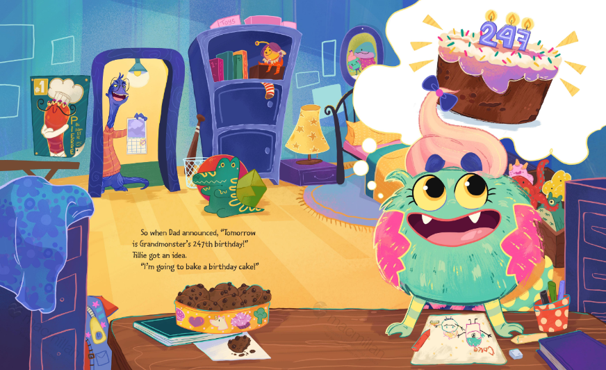 Despite not vibing with that manuscript, I loved the spunky, brave best friend I had cast for my main character. I found myself recasting her as the best pal in a few subsequent stories. Finally, it clicked: this best bud needed a tale of her own. Why hadn’t I thought of that before? It was like an idea bubble had popped up above my head; much like my little amateur chef, Tillie, realizing that she could bake a cake on her own, without Grandmonster’s help.