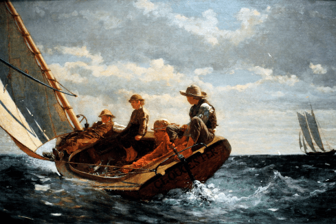 I remember the Winslow Homer painting, “Breezing Up,” shown in the book, from my childhood—we had a print of it on our dining room wall in our home, and it fascinated me. Van Gogh became my favorite painter as I saw more of his work…I love his fresh, sensuous brushstrokes, his use of “participatory” (somewhat distorted) space, and wonderful awareness of pattern. And I adore Daumier’s dynamic lines and Hopper’s melancholy city.