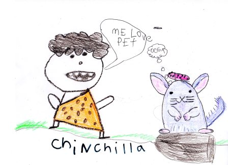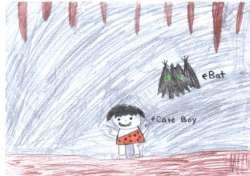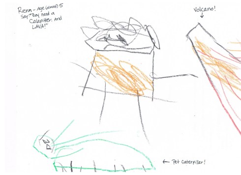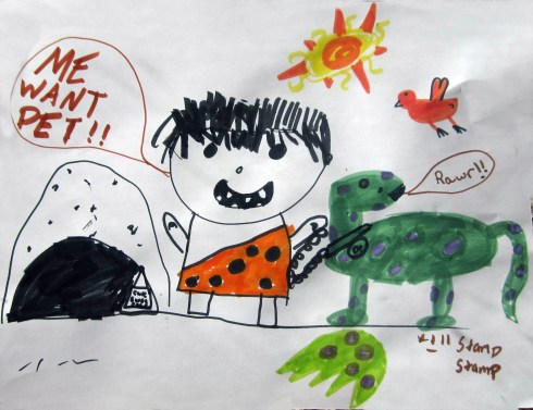 Daughters want draw. I ask, “What pet you want Cave Boy have?”