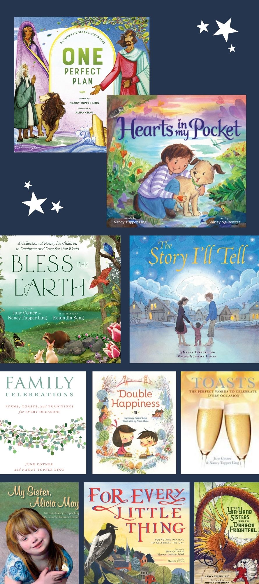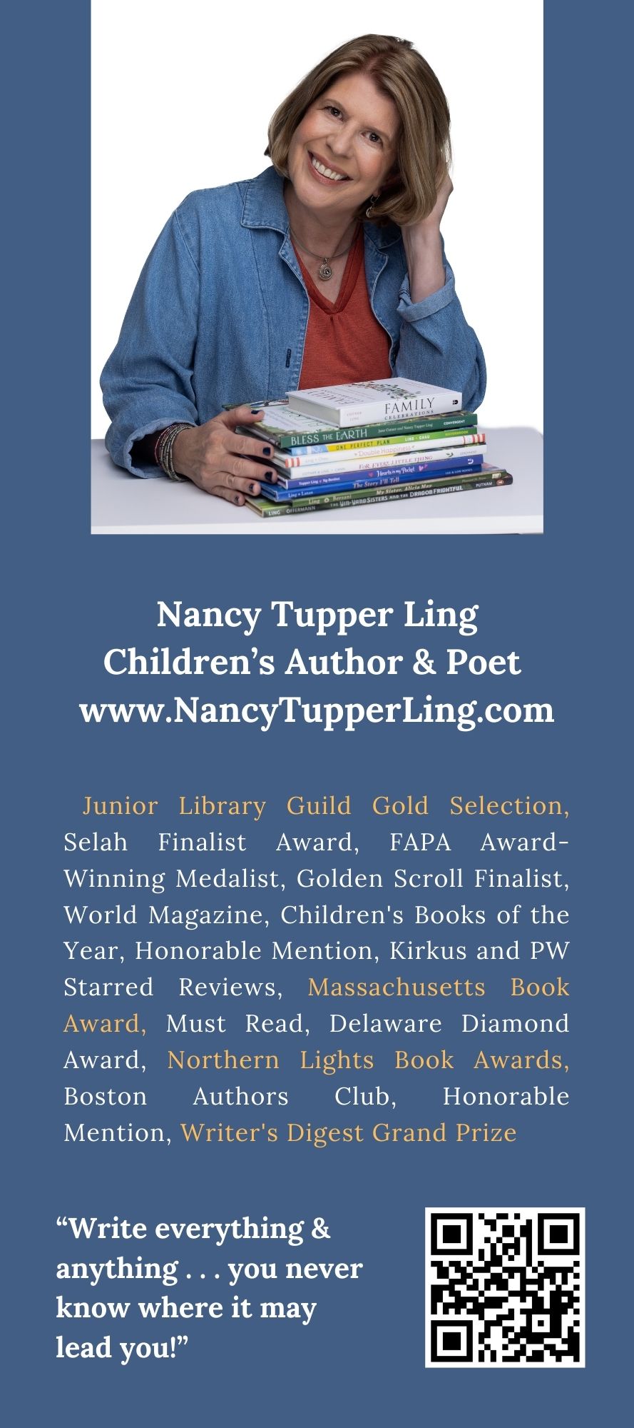 Nancy Tupper Ling is a children’s author, poet, book seller and librarian. Her latest books are Hearts in my Pocket and Bless the Earth with co-editor, June Cotner. Along the way her work has received various honors including the Writer’s Digest Grand Prize, Delaware Diamond Award, Northern Lights Book Awards, and a Golden Scroll Award Finalist. Visit her at NancyTupperLing.com and follow her on Blue Sky and Instagram.