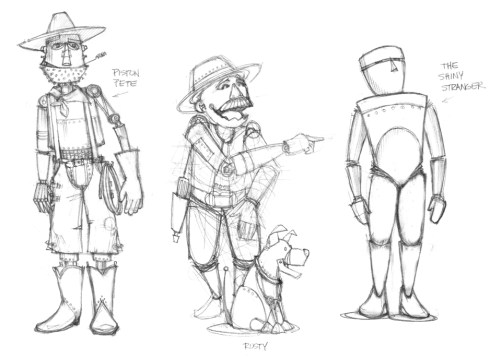 “The working title is “Robot Rodeo,” made up this summer while illustrating the bookshelf of the main character in Heather Burnell’s picture book, Bedtime Monster. It popped back into my head when I was trying to come up with an idea for day three of the PiBoIdMo challenge. The title was about all I had until I started sketching, and then the robot steer with his knobs and levers began to take on a sort of gentle steampunkish look, which gave me a bit more of a hook for the story. I’ve got a very rough first draft down, featuring a showdown between one of the battered old cowboy robots, Piston Pete, and the ‘shiny stranger,’ who’s, um, not from around here.”