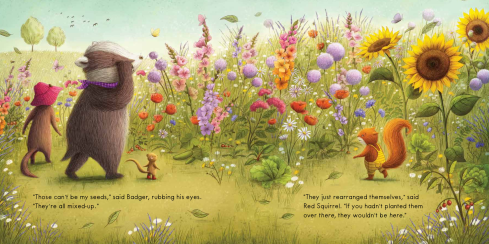 Ramona Kaulitzki’s illustration of Badger as he embraces his mixed-up garden shows him caught in a swirl of flowers and vegetables. His expression is one of serene happiness. Indeed, Ramona’s art beautifully captures Badger’s feelings from beginning to end—from hopeful, studious, and excited, to dejected, to that tranquil contentment.