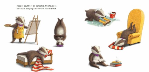 Of course, Badger is devastated when his vision is destroyed. He does what many of us do or would like to do. He stays inside, “busying himself with this and that,” so he doesn’t have to think about his perfect garden ever again!