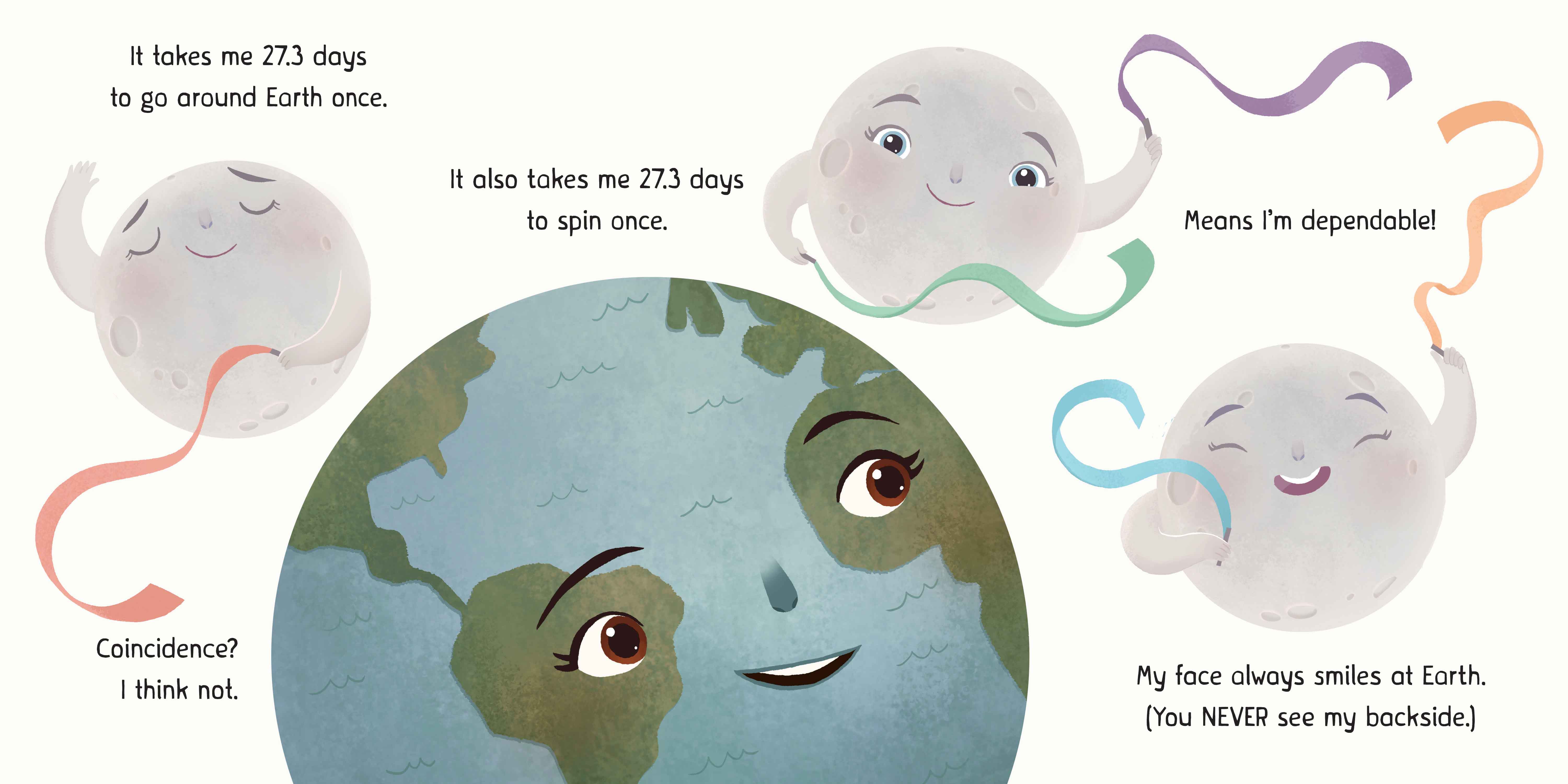 I learned about synchronous rotation: Moon rotates on her axis and revolves around Earth at the same rate, approximately 27.3 days. That means we see the same face of Moon. I do talk about this in the book, but I never get to use the term “synchronous rotation.” It’s such a nerdy-sounding phrase. I love it. “I suffer from synchronous rotation.” Also, here’s a fun-fact that didn’t make the cut. Moon is moving farther away from Earth at a rate of one inch per year. Bye-bye, Moon!