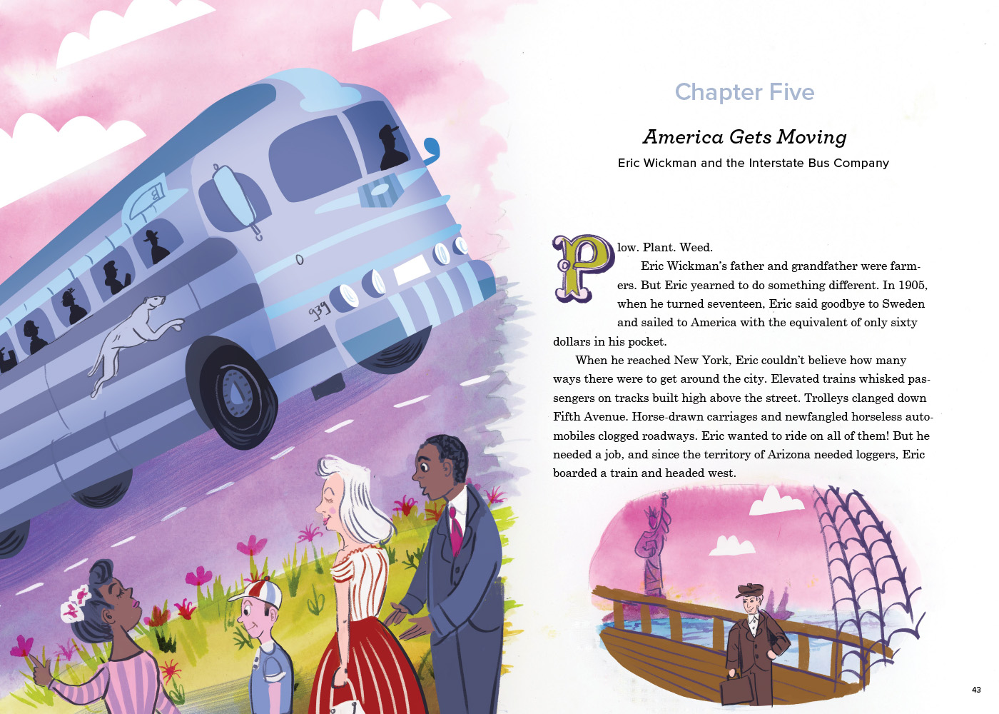 The idea for the first story actually came from my sister who had told me about a friend of a friend who was the granddaughter of the founder of the Greyhound Bus Company. It sounded like a fascinating story—my curiosity was piqued—and I dug deep into finding out more. After writing the rough draft and many rounds of revision and critique group feedback, my agent submitted it and we got interest from Ann. But the editor wasn’t sure if Eric and the bus were strong enough/popular enough to be a stand-alone picture book. Ann had an idea…would I be willing to write several more stories, similar in structure and tone, about the invention or creation of other things that move?