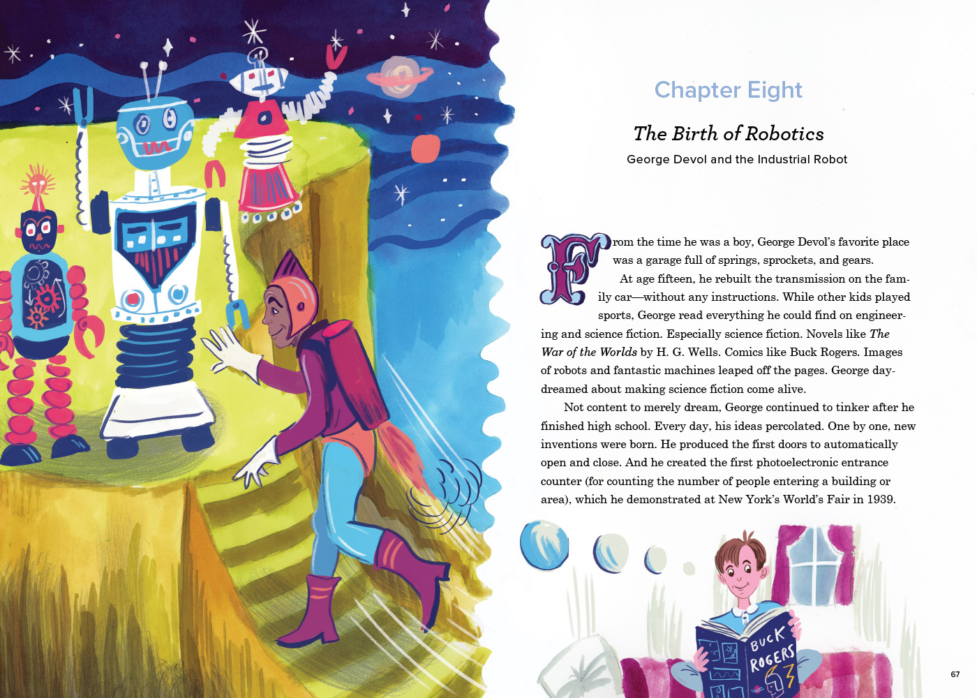 I got down to business. First, I made a list of vehicles, like the car and the train. I already had a manuscript about the invention of the hot-air balloon—maybe I could tweak it to fit this collection. But Ann also wanted me to think outside the box of things that move. Maybe a robot, she suggested. And I wondered, who invented the first robot? Early on, robots were part of science fiction—in the writings of H.G. Wells and Isaac Asimov. I dug deeper. I discovered the story of a young boy of fifteen who rebuilt the transmission of his family’s car—without an instruction manual. When he graduated from high school, he designed the first automatic doors. He engineered the first photoelectric entrance counters which were demonstrated at the 1939 World’s Fair. And he built the first robotic, a mechanical arm used at a General Motors factory in 1961 to weld car parts. His name? George Devol, the Father of Robotics. But I’d never heard of him and perhaps most of you haven’t either. I guess that’s another reason I write these narrative nonfiction biographies—I’m passionate about sharing the lives of these ordinary people who have done extraordinary things. I’m hoping to spark the curiosity of young readers to inspire them to create their own magic.